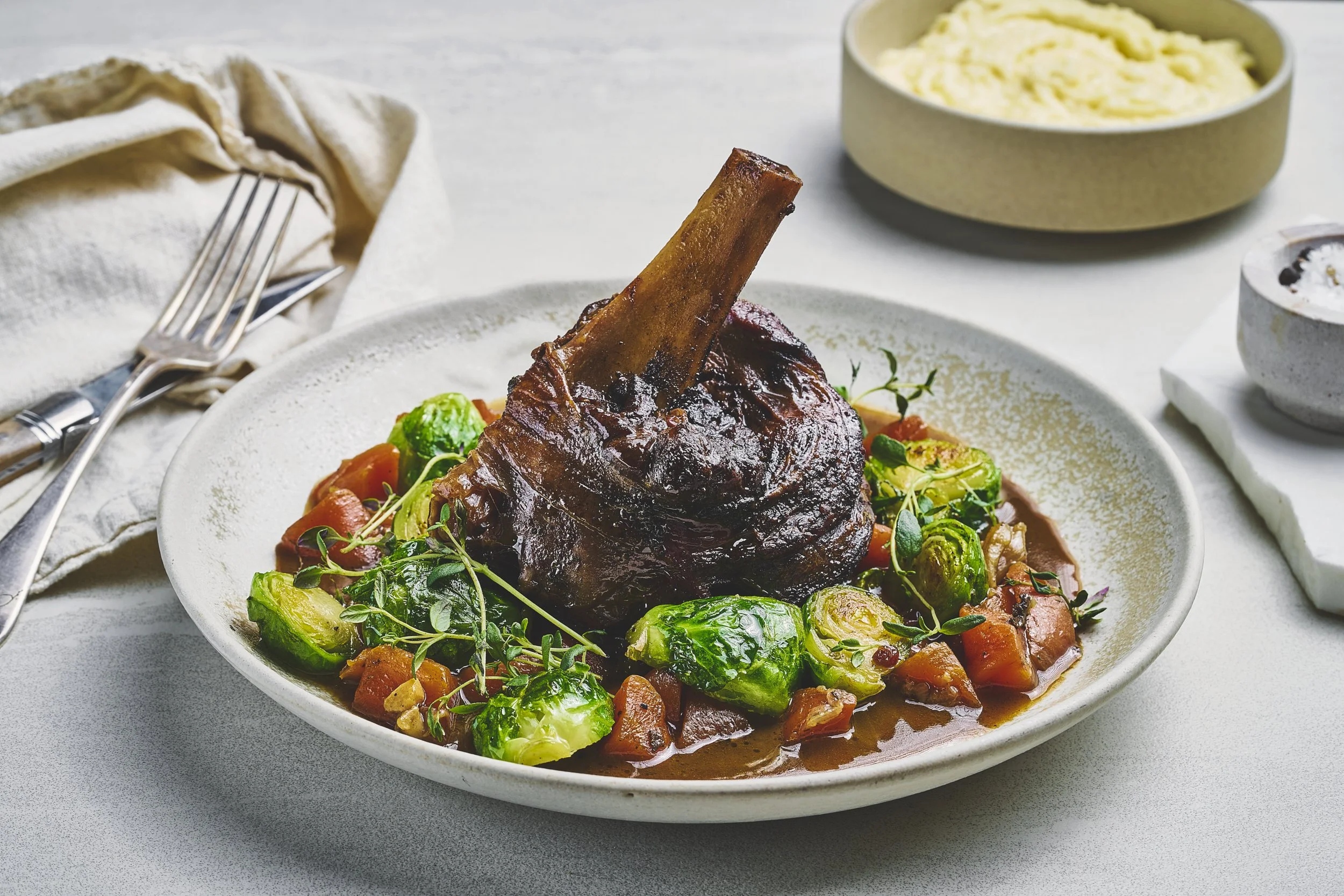 Langtidsstekt reinsdyrskank med honningglasert rosenkål og sjysaus